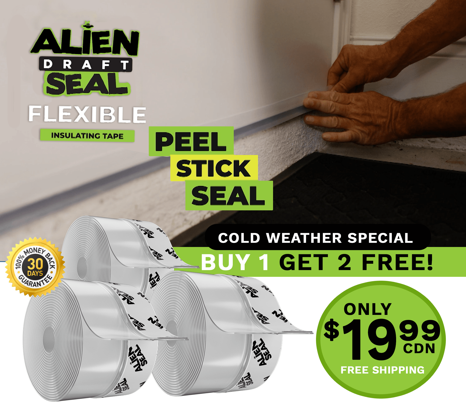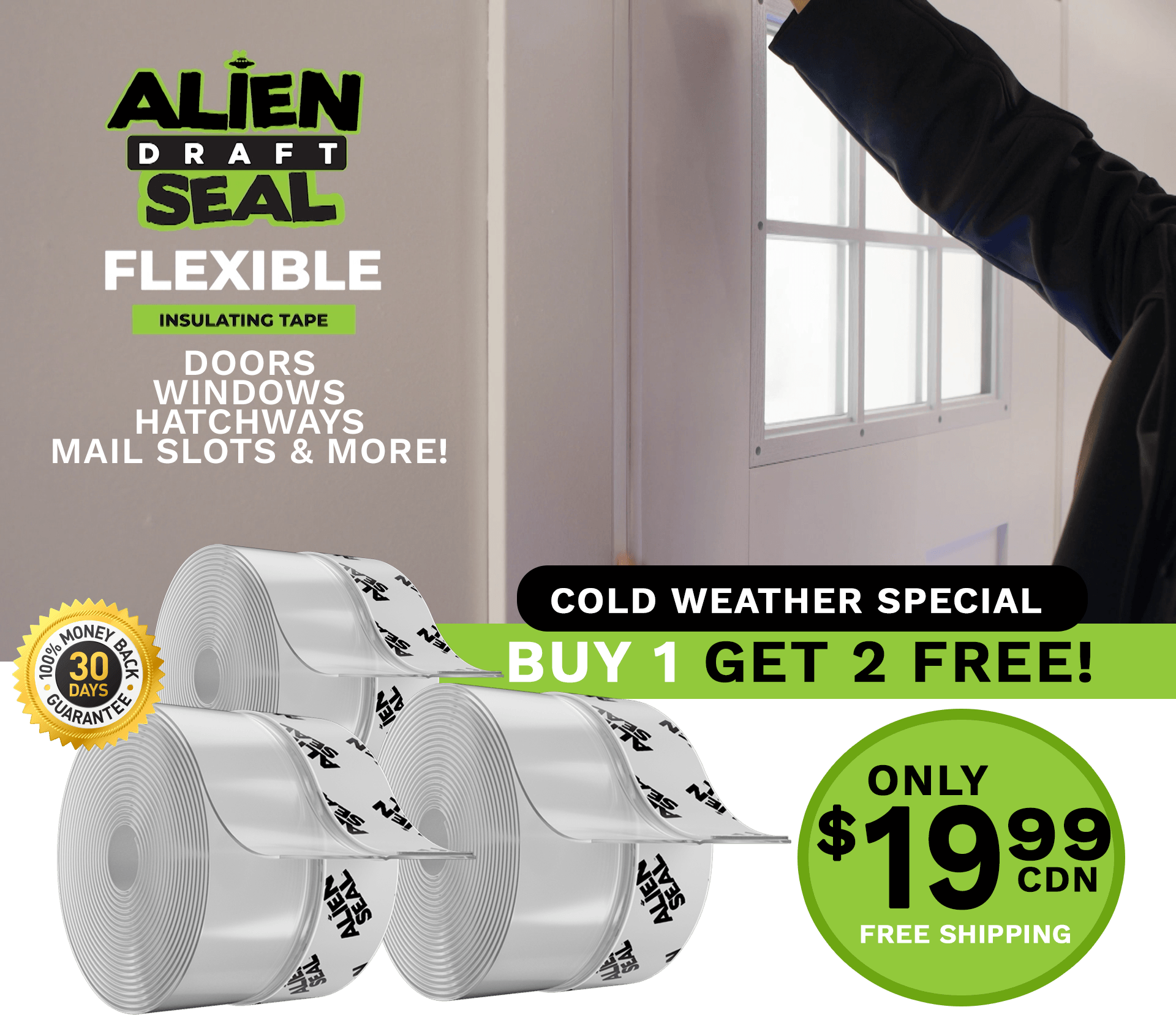 We are offering Alien Draft Seal direct to consumers. You can't buy Alien Seal at stores!And don't forget...When you buy just ONE roll of Alien Seal today we'll add TWO ROLLS for free! You'll get 3 rolls for just $19.99 + FREE SHIPPING!